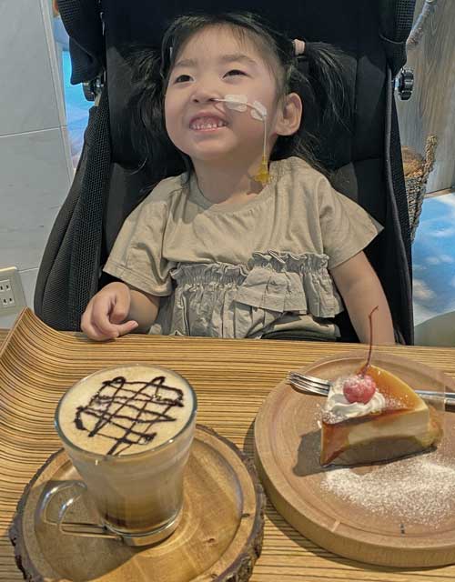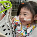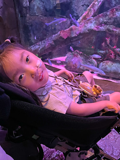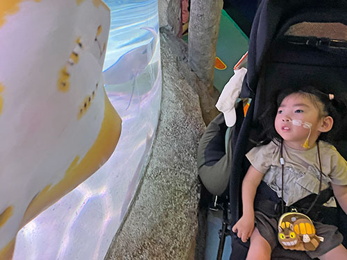 ご機嫌とまではいかないけど、クラゲゾーンで水槽の色が青や赤色など光が変化するところでは笑顔も見られた。クラゲで喜んでいるのか、光の変化が楽しいのかどっち!?