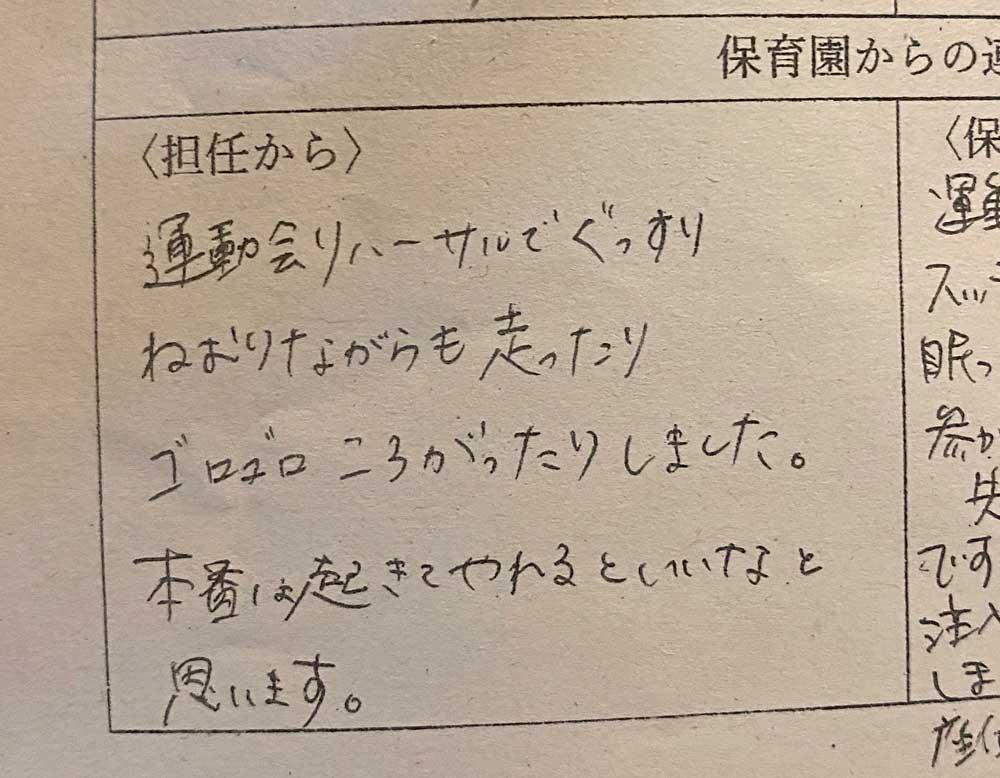 運動会リハーサル diary 2022.09.292022.09.27 10月に保育園の運動会あるため、今日は9:00からリハーサル しばらく休んでて復活してからの1日目、完全復活してるわけではないのでできるか分からんけど保育園に預けてきた そして、、、 迎えにいって今日のリハの件について教えてくれたリハーサル中ほぼ寝てたらしい、、、保育園の記録には“ねむりながらも走ったりゴロゴロころがったりしました”と。 ゴロゴロされてなぜ起きん⁉️ そのあと本番についての話しをした 先生 もし本番【め】が寝てたら運動会どうしますか? 寝てても強行突破でお願いします!!